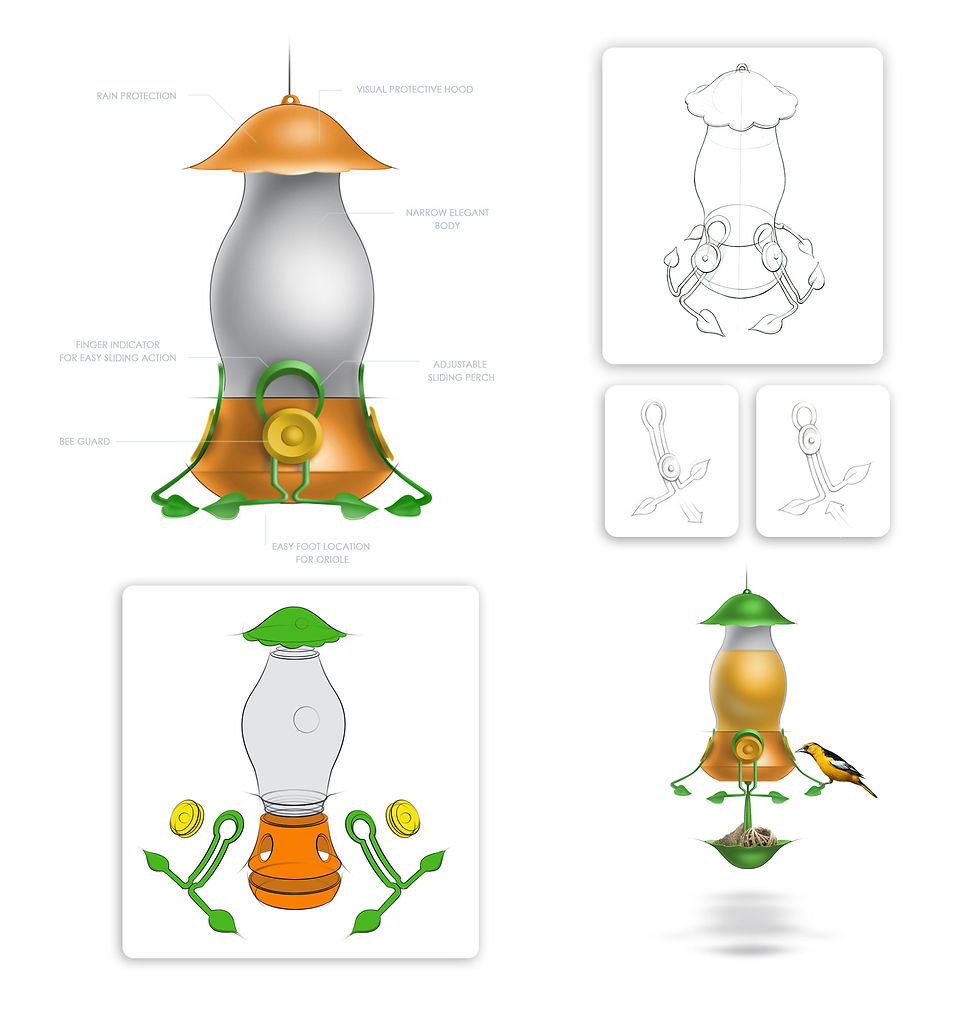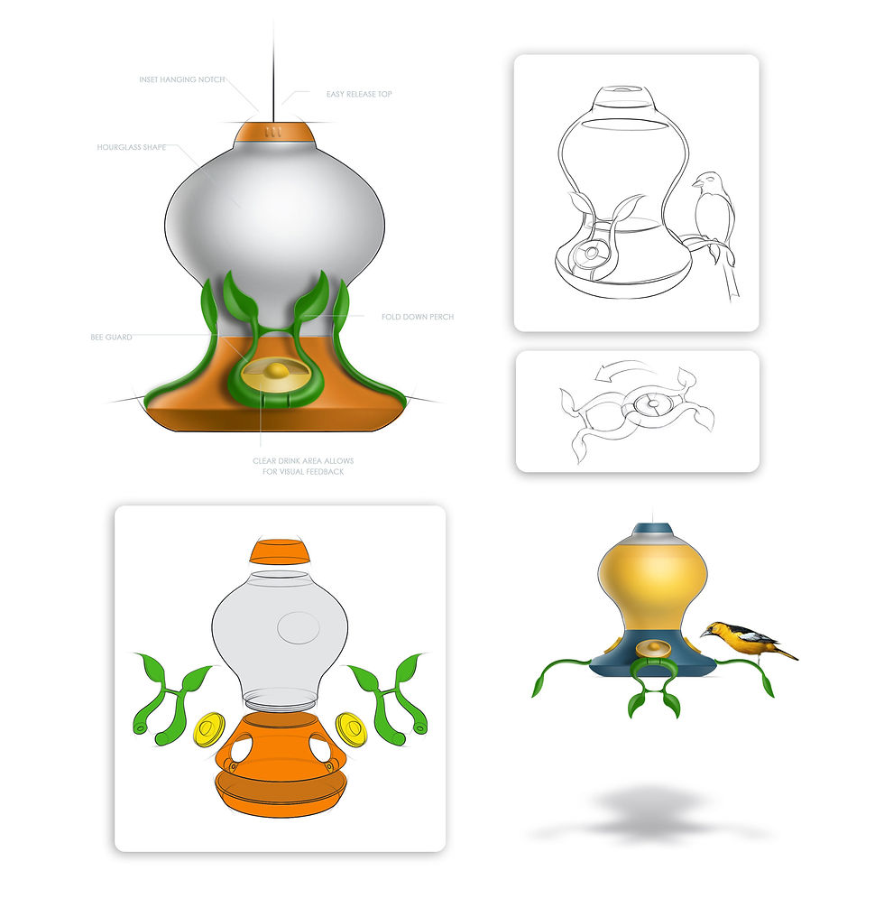 The Oriole Bird Feeder is one of the first products I designed that went to market. I used a mix of traditional and digital sketching / rendering (photoshop) to communicate my ideas to the client and our engineering team.